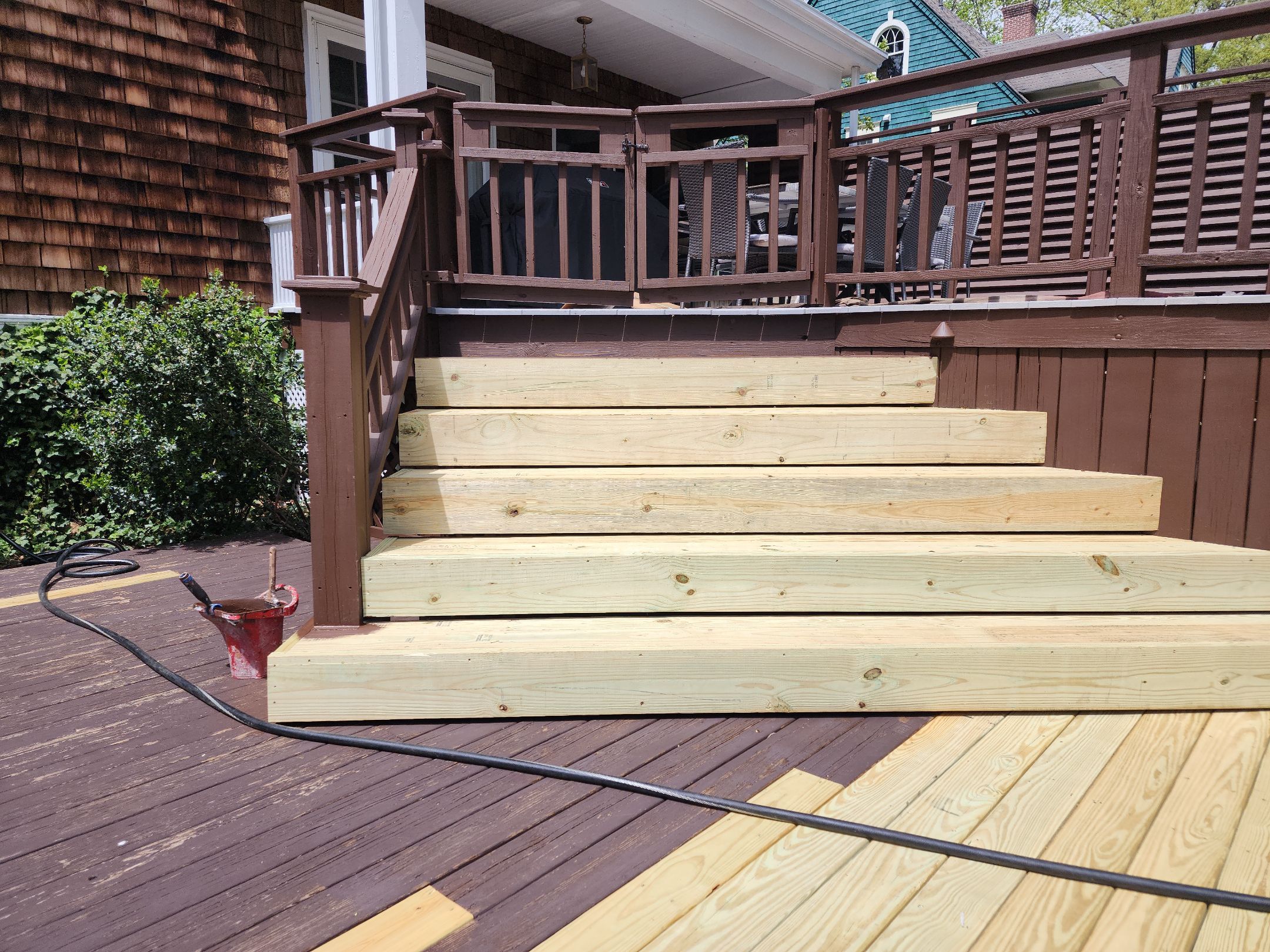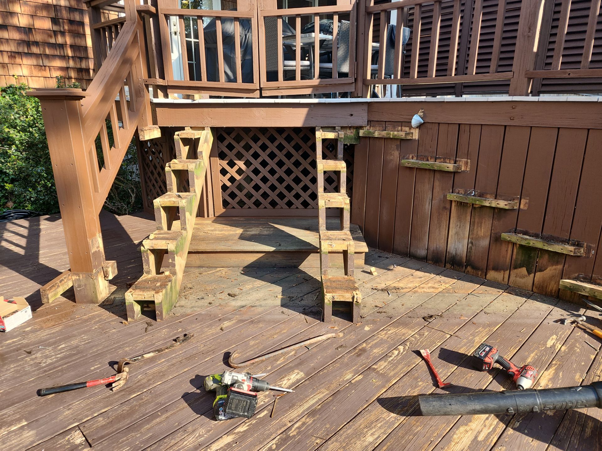 Our first step was removing the failing stairs and building a brand-new staircase so the deck was safe, solid, and ready for restoration.