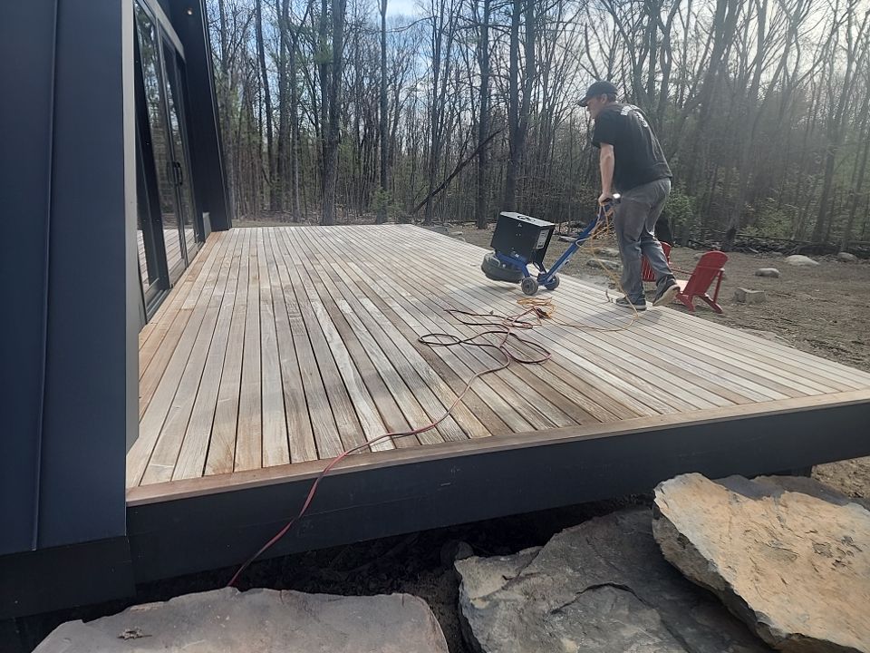Over time the deck had weathered and started to lose its rich color. We began with a professional Deck Cleaning process designed specifically for hardwood decks like IPE. This step safely removed dirt, organic growth, and weathering without damaging the wood.